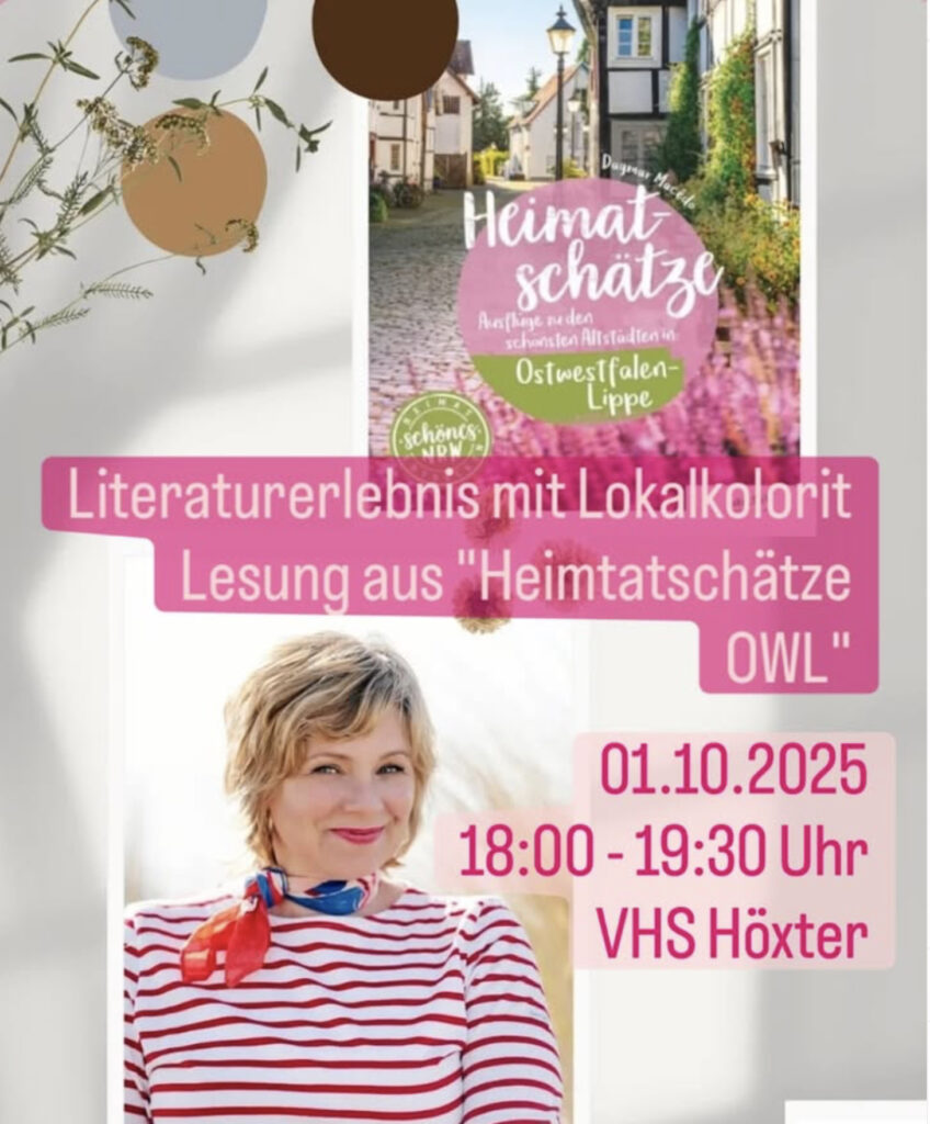 Mein neues Buch Heimatschätze- Ausflüge zu den schönsten Altstädten in Ostwestfalen-Lippe hat Lesungspremiere am 1. Oktober 2025 um 18 Uhr in der VHS Höxter. (Übrigens mein 2. Besuch in der VHS in diesem Jahr. Im März habe ich hier mein Buch Lost & Dark Places OWL präsentiert).