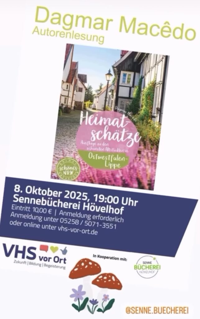 Am 8. Oktober um 19 Uhr präsentiere ich dann meine Heimatschätze in der Sennebücherei in Hövelhof. (Die VHS vor Ort hat mich zum dritten Mal nach Hövelhof eingeladen).